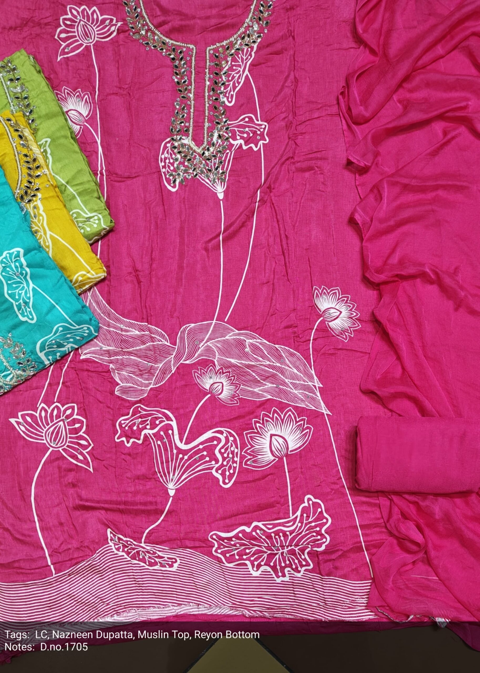 Elegant Najneen Dupatta Maslin Top Suit Set with Reyon Bottom