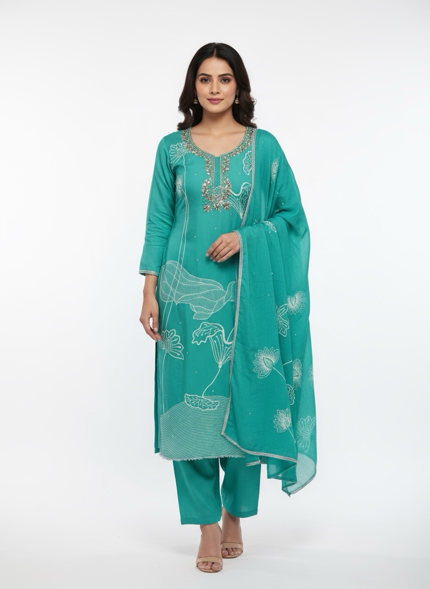 Upgrade your ethnic wardrobe with this stunning suit set, featuring a luxurious Maslin top adorned with intricate embroidery, paired with a soft Najneen dupatta and comfortable Reyon bottom. Available in four elegant colors—teal blue, magenta, olive green, and mustard yellow—this collection brings a fresh, vibrant look to any occasion. The floral embroidery and fine detailing on the neckline add sophistication and charm. Perfect for festive wear, parties, or casual outings, this suit set ensures you stand out with effortless grace.