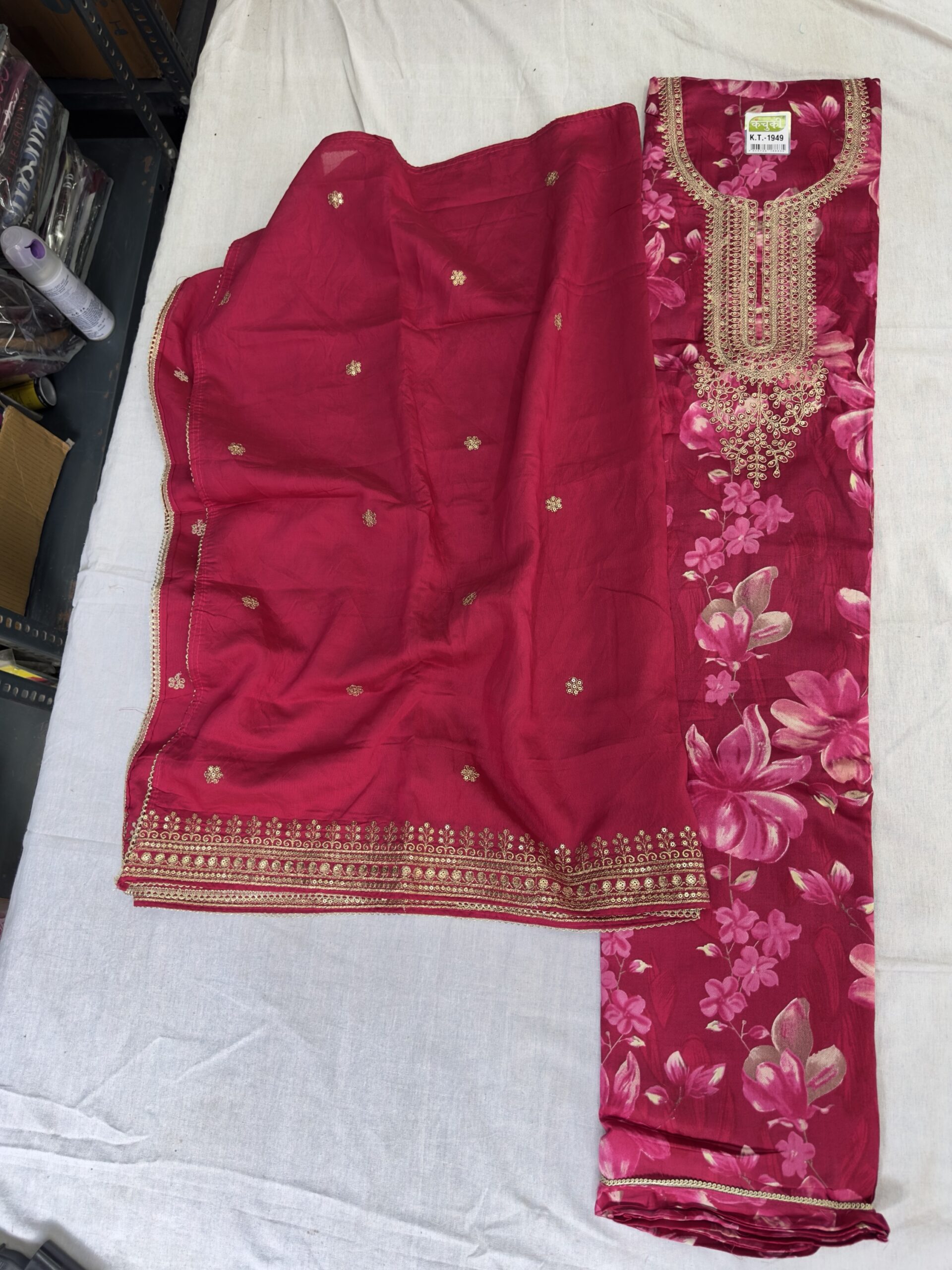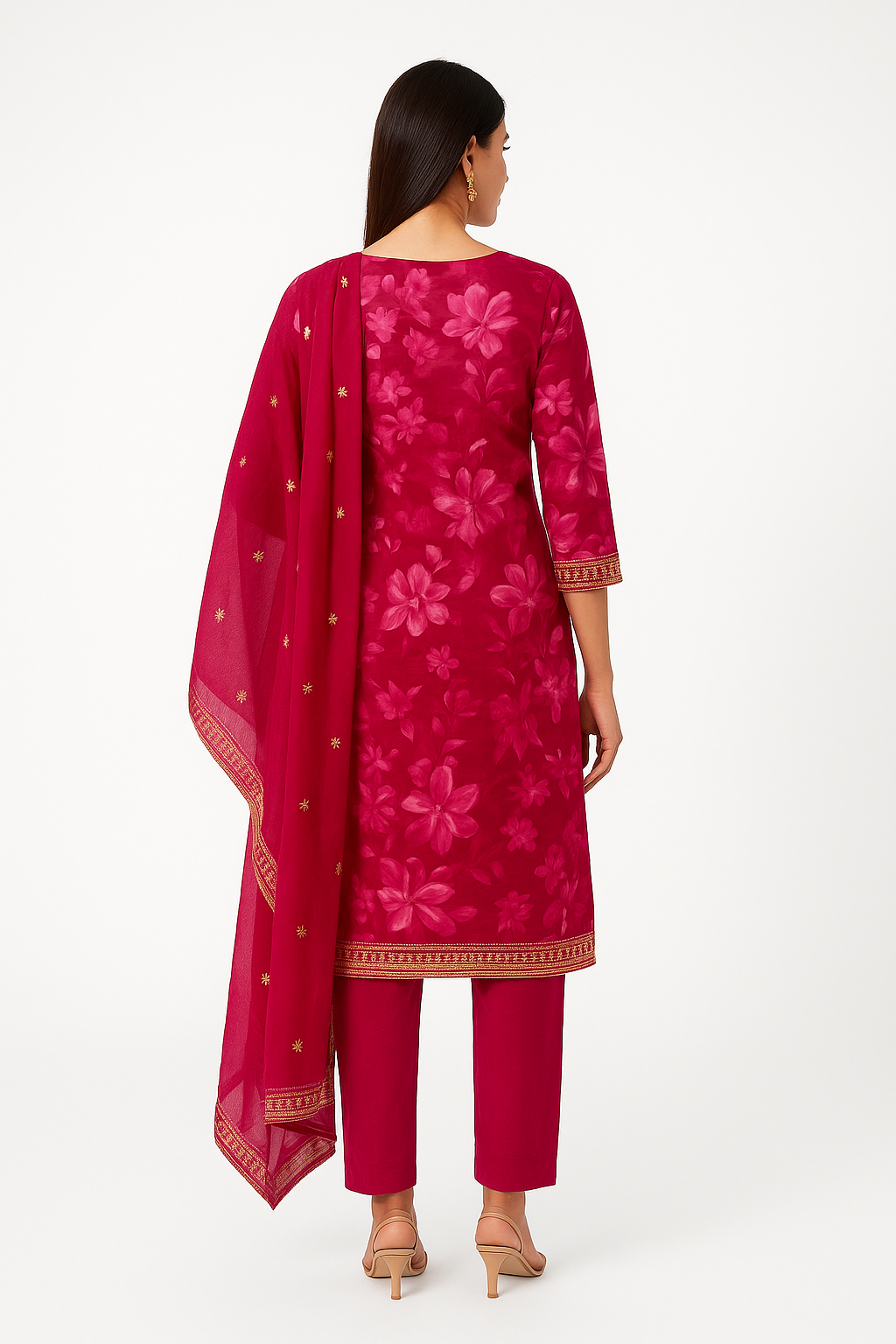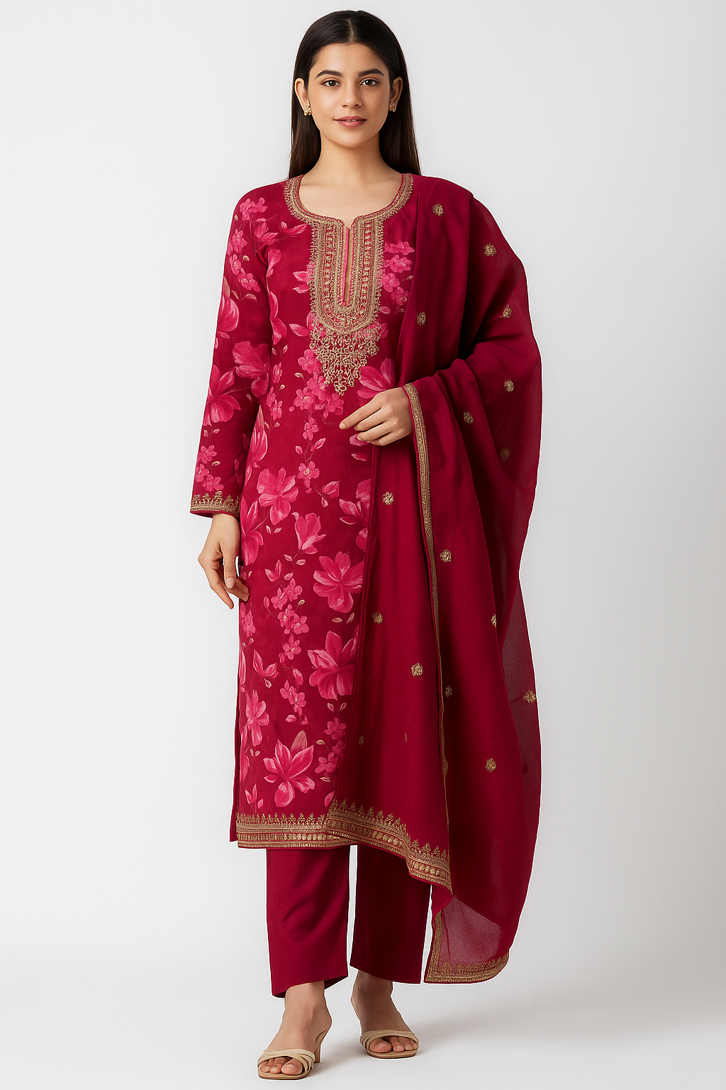 Elevate any occasion with the elegant “Kunchki” suit, featuring a premium jam cotton top, a matching cotton bottom, and a beautifully crafted chanderi dupatta. The top showcases vibrant floral prints with intricate embroidery work on the neckline that adds sophistication to the ensemble. The chanderi dupatta is adorned with delicate motifs and zari borders, creating a graceful finish that perfectly complements the rich texture of the outfit.